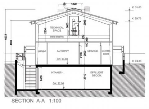 Í kjallara er meðhöndlun á affalli, á miðhæð er krufningsherbergi og rannsóknarstofa og loftræsti- og síunarbúnaður á efstuhæð. Strangar vinnureglur eru viðhafðar og notaður einnota öryggisklæðnaður.